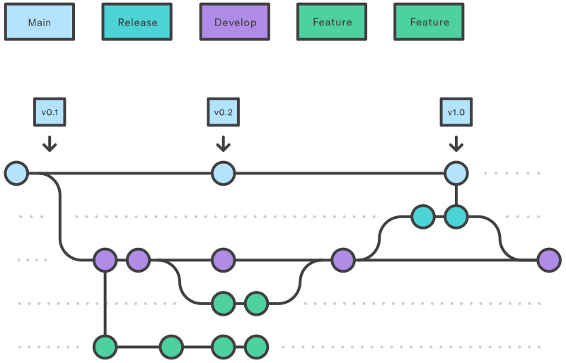 main 브랜치는 배포 가능한 상태만을 관리하며, 커밋할 때는 태그를 사용해 배포(Release) 번호를 기록합니다. 위의 Workflow를 이용한 협업에서 작업한 결과물을 서브 브랜치가 아닌 main에 바로 올려 버리면 안됩니다.