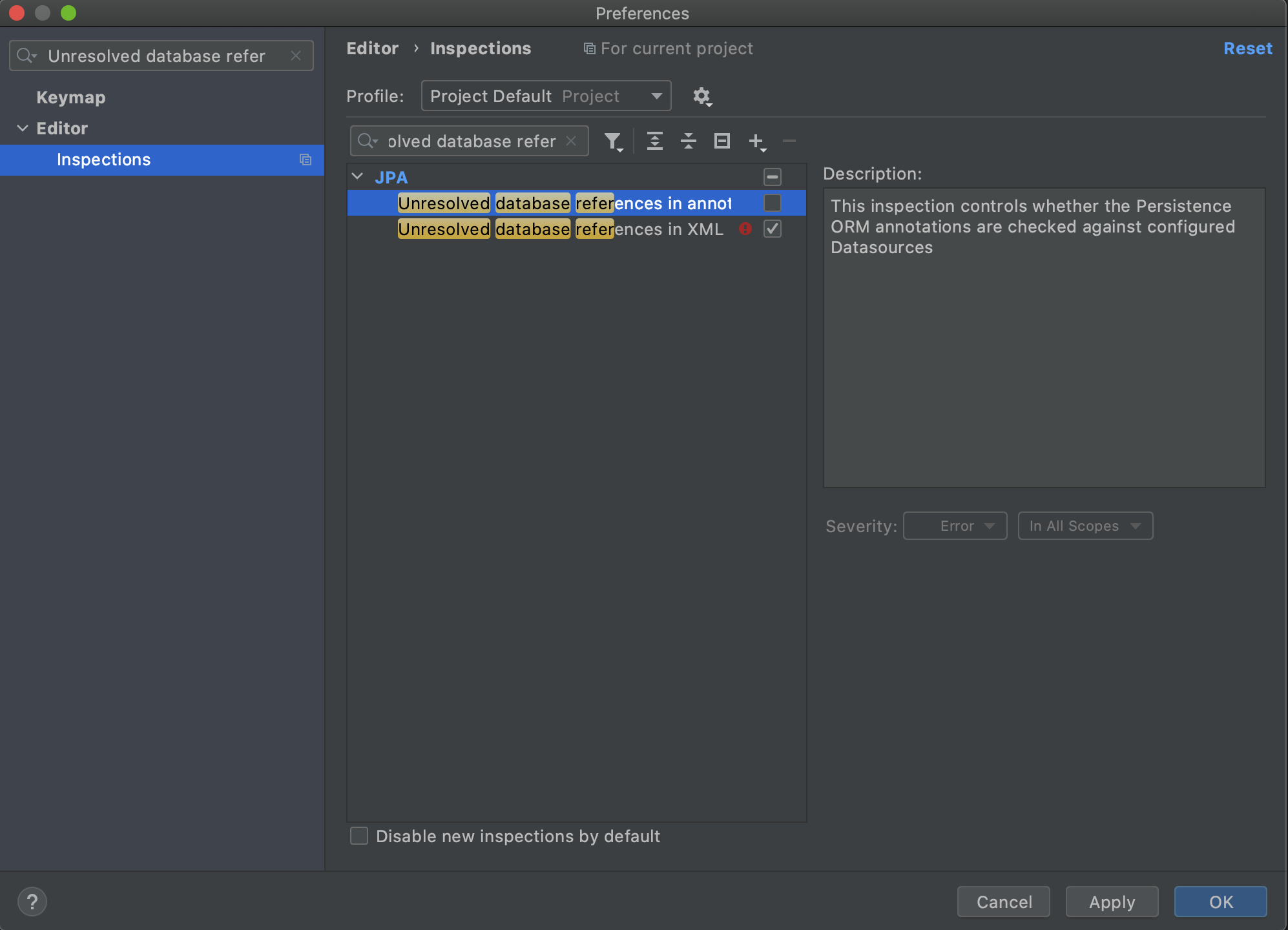2. Editor -> inspections 에서 "Unresolved database refereces in annotations" 옵션을 체크 해제, Apply 혹은 OK.