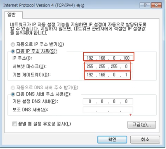 물론 네이버를 IP주소로 찾아가는 사람은 없으니, 아래 DNS 서버까지 세팅해 주면 인터넷이 된다.