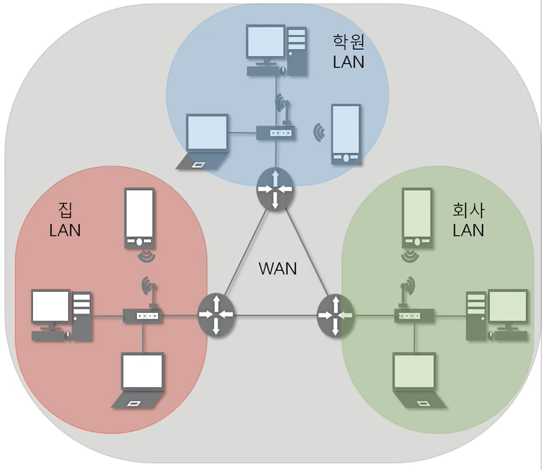 서로 다른 LAN과 LAN 을 연결시켜주는(WAN에서 통신) 일을 하며, 라우터와 같은 3계층 장비가 필요하다.