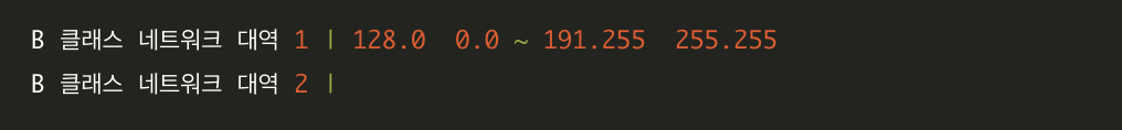 | B | 10xxxxxx , 두번째필드 | 128.0.0.0 | 128.0.0.0 ~ 191.255.255.255 |