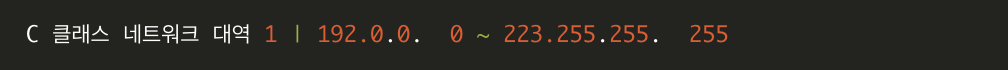 | 클래스 | 네트워크 구분 | 시작주소 | 주소범위 |