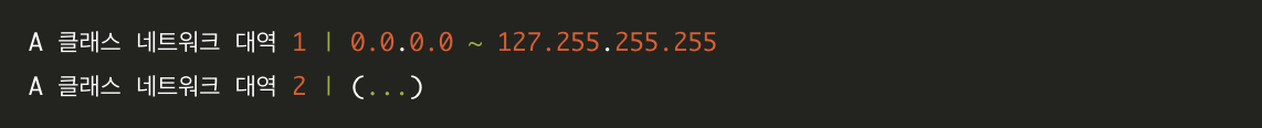 | A | 0xxxxxxx , 첫번째필드 | 0.0.0.0 | 0.0.0.0 ~ 127.255.255.255 |