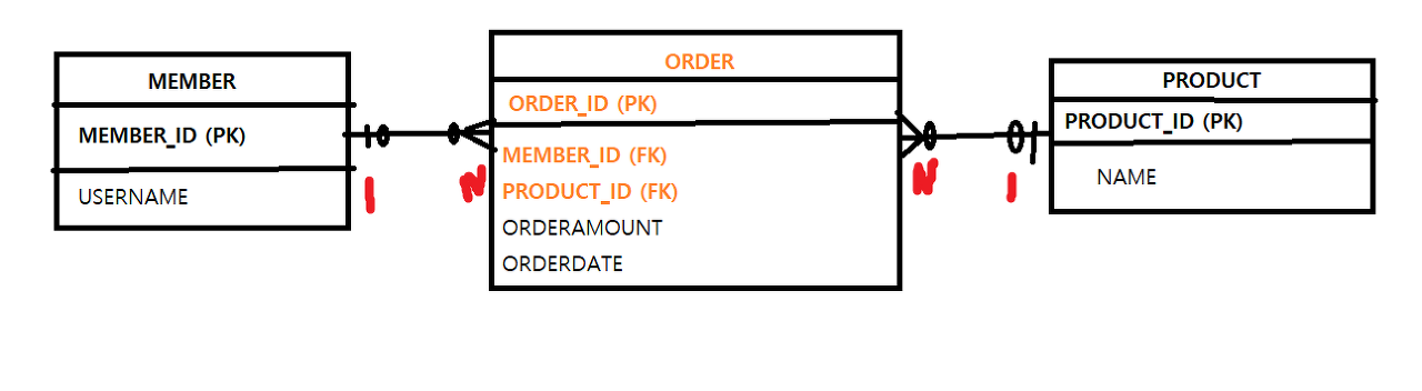 아래 그림에서는 Member와 Product의 다대다 관계를 Order 엔티티를 추가하며 1대다, 다대1 관계로 풀어냈다.