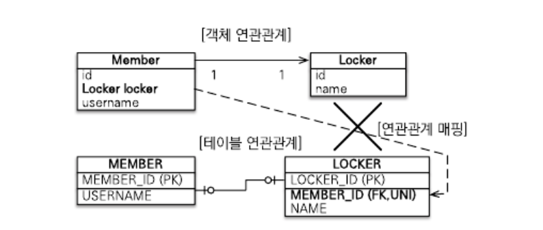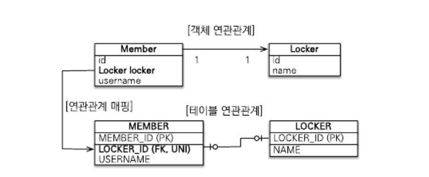 장점은 주 테이블만 확인해도 대상 테이블과 연관관계가 있는지 알 수 있다는 점으로, 객체 참조와 외래 키를 비슷하게 사용할 수 있다. 해당 방법을 사용하기 위해서는 외래 키에 데이터베이스 유니크 제약조건을 추가해주어야 한다. (이것 말고는 일대다, 다대일과 굉장히 비슷함) 위 예시에서 주 테이블은 MEMBER이고, 대상 테이블은 LOCKER 다.
