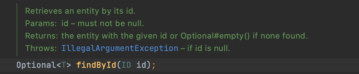 그럼 이제 Optional<T> findById(ID id) CrudRepository의 findById를 살펴보는 것으로 Optional에 대해 간단하게 살펴보자.