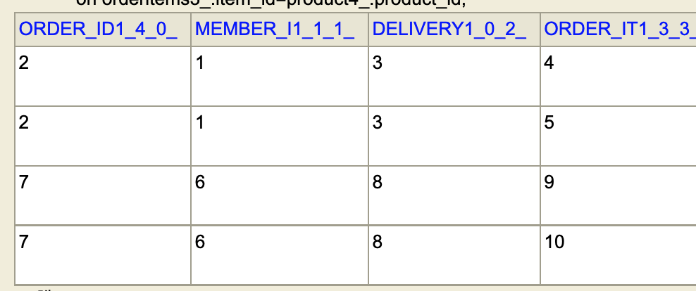 여기서 회원1이 상품1, 상품2를 주문하고 / 회원2가 상품1, 상품2를 주문하여 DB에 그 정보가 저장되어 있다.