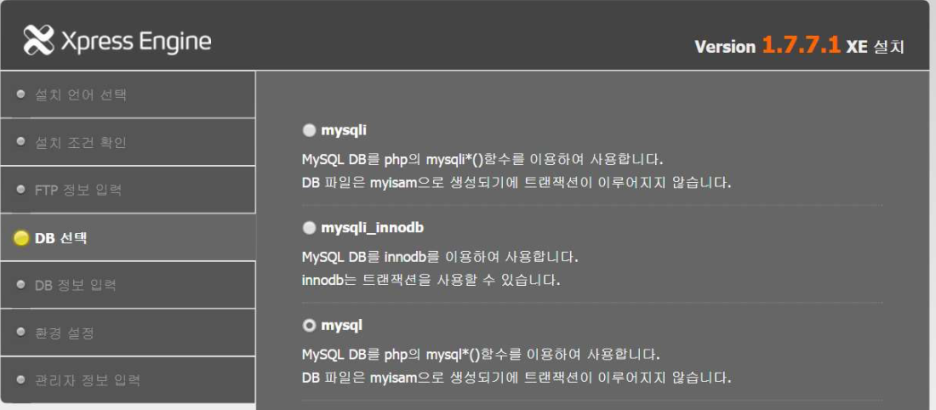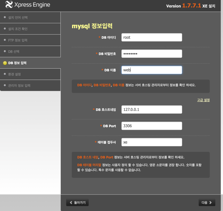 설치된 mysql에 접속해서 xe DB를 생성한다.