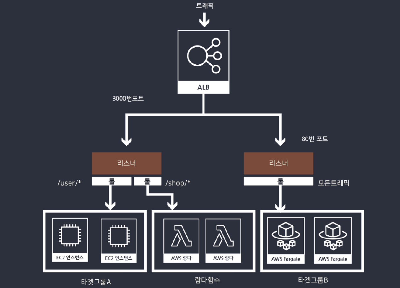 4) 사용자는 로드밸런서의 (Port가 일치하는) 리스너에 접근하게 되며 리스너는 이 요청을 받아들여 적절한 대상그룹으로 전달