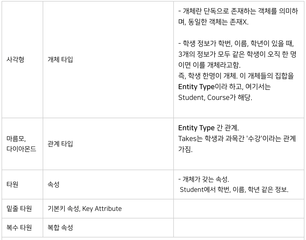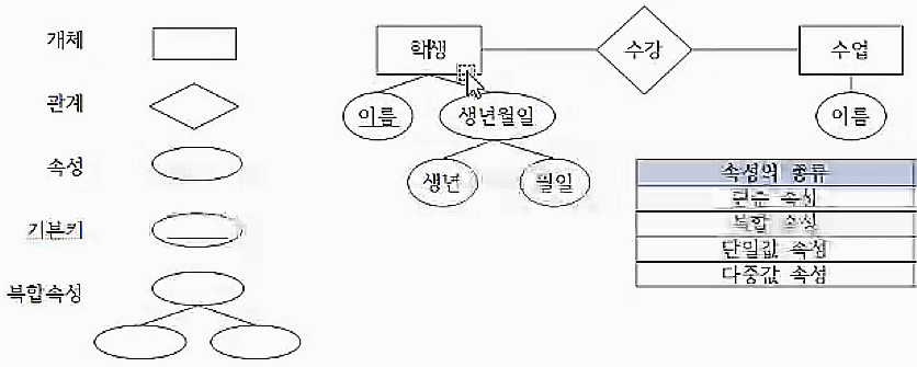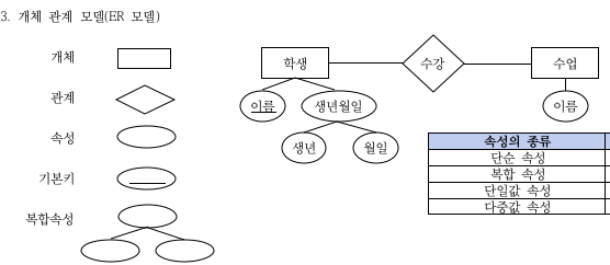 개체 : 표현하려는 유형, 무형 정보의 대상(=무형인 '시간' 혹은 현실세계에 없는 용 도 저장할 수 있다.)