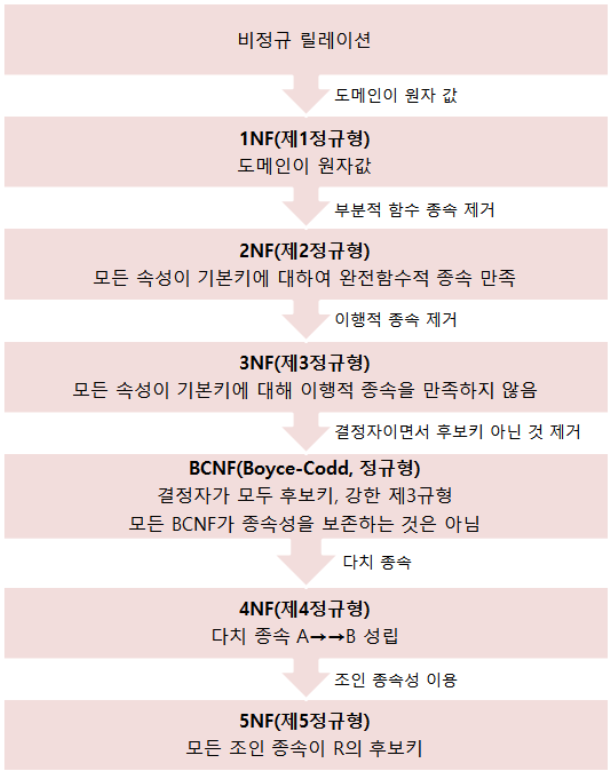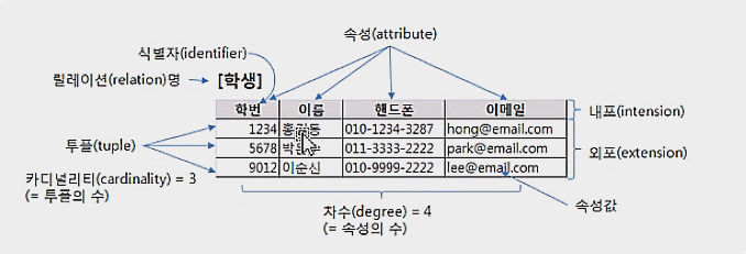 관계 : 개체간 또는 속성간의 관계(1:1, 1:N, N:M)