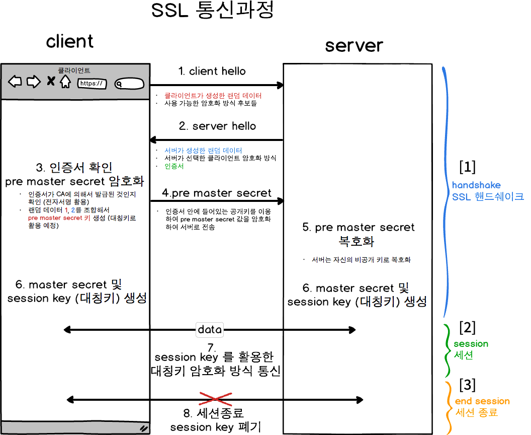 - 인증서 : 서버의 공개키를 포함한 자신의 SSL 인증서 사본을 보낸다.