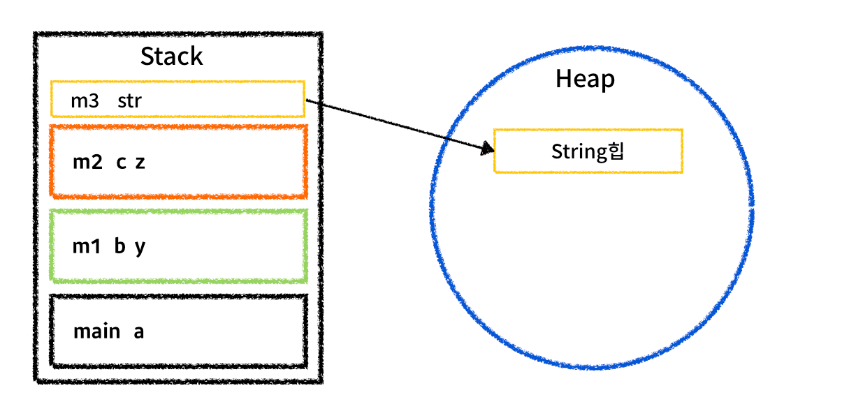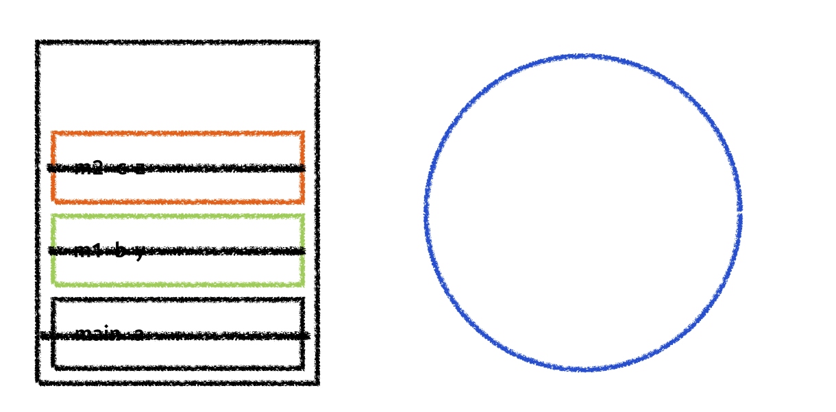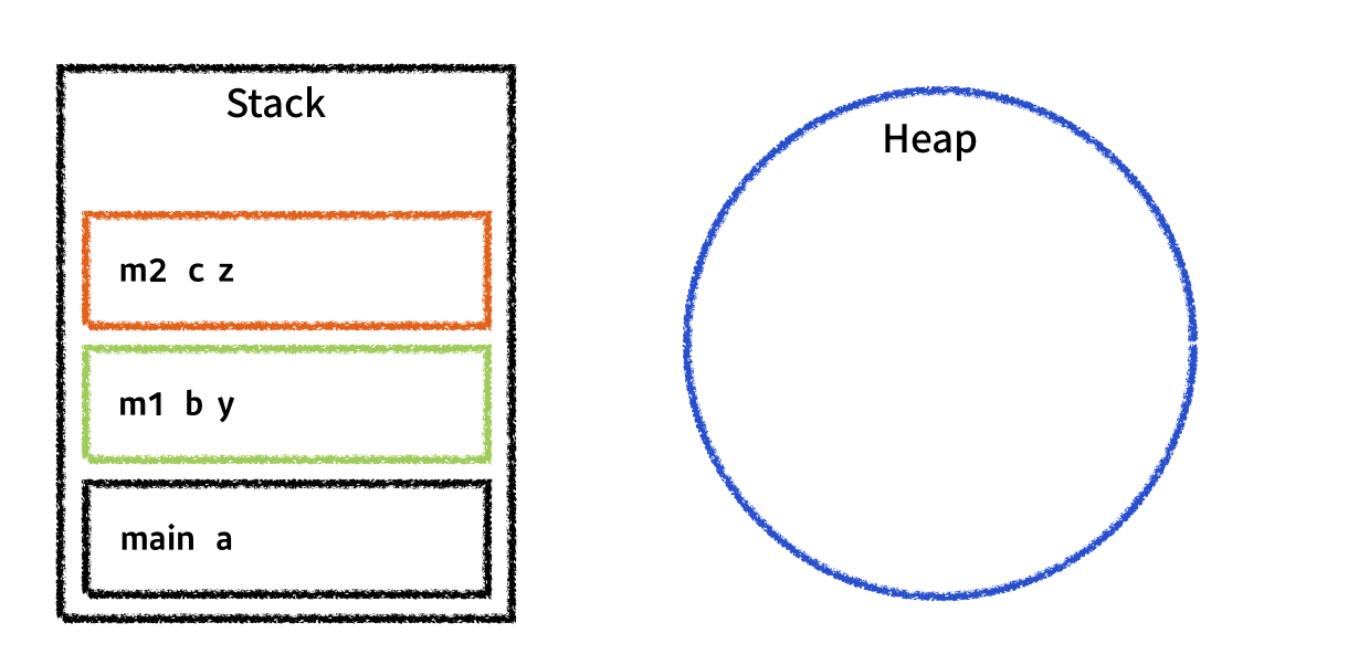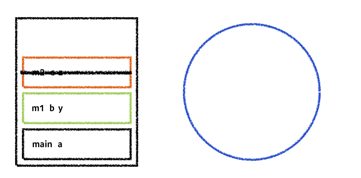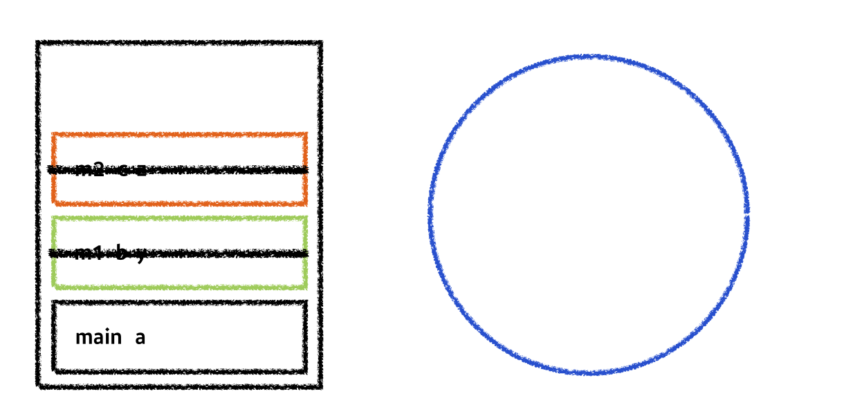 이를 그림으로 보면 가장 먼저 main 프레임이 생기고, m1, m2가 쌓인다.
