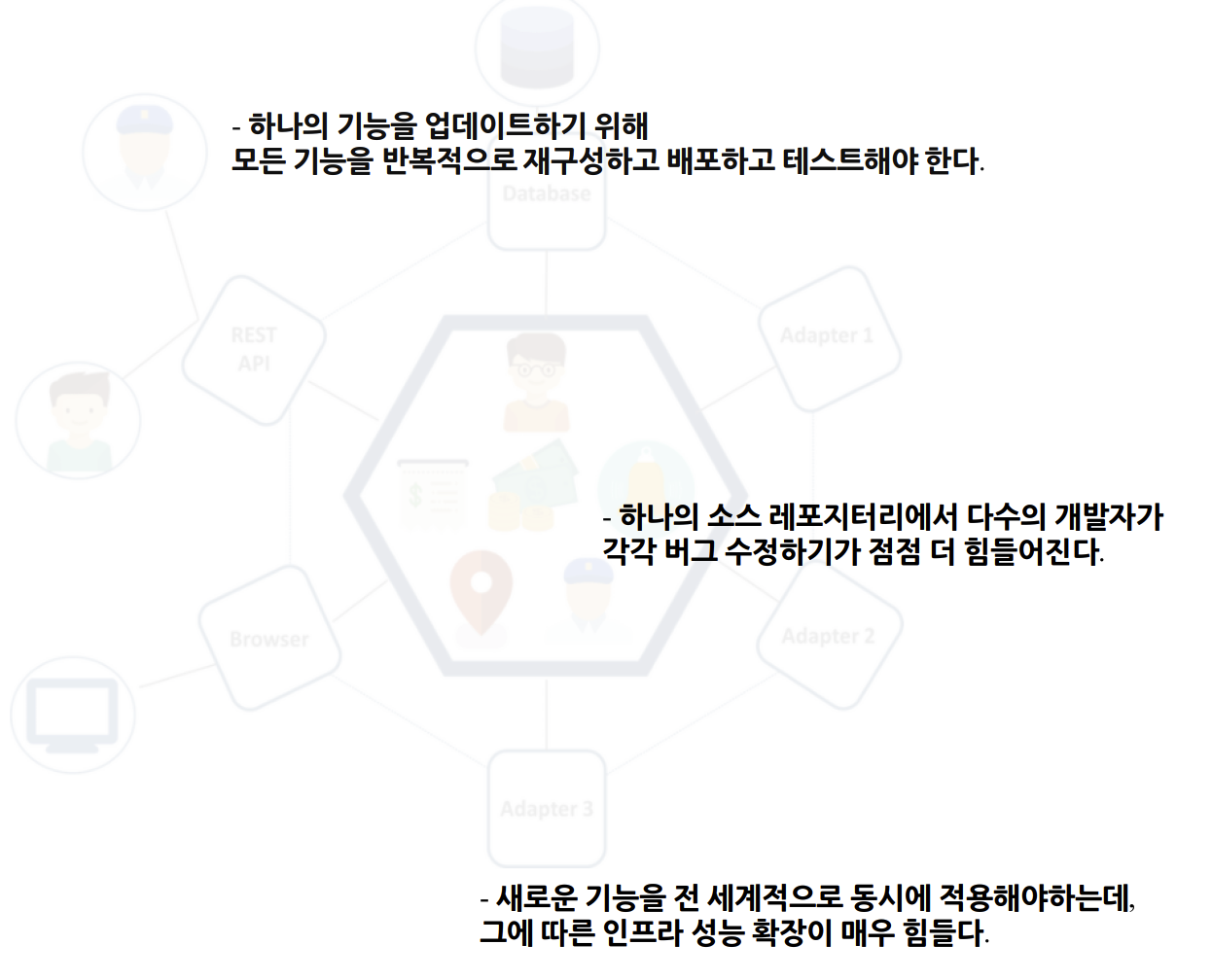 우버가 직면한 문제점에서 볼 수 있듯, 모놀리틱 구조의 단점은 다음과 같습니다.