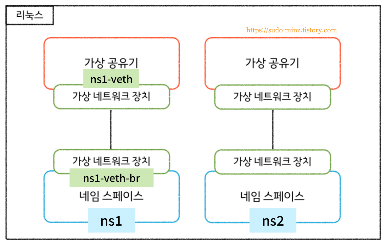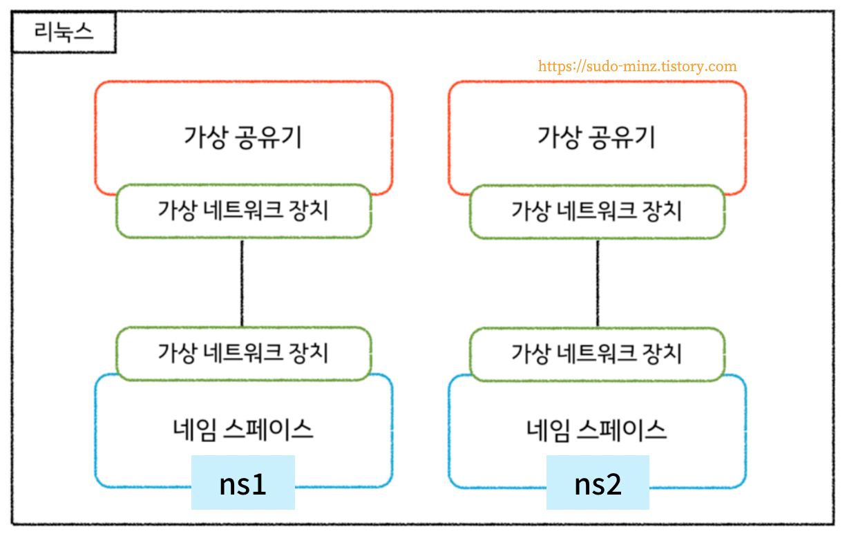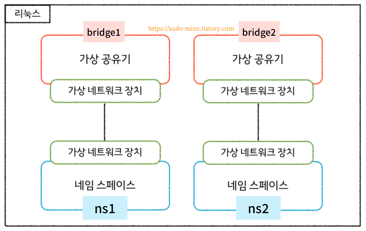 - 한 대의 리눅스에서 2개의 네트워크 네임스페이스(ns1, ns2)를 생성