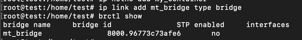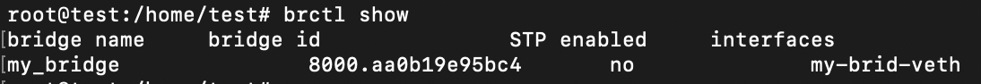 먼저 brctl show로 브리지(mt_bridge)와 포트 연결(my-brid-veth)을 확인합니다.