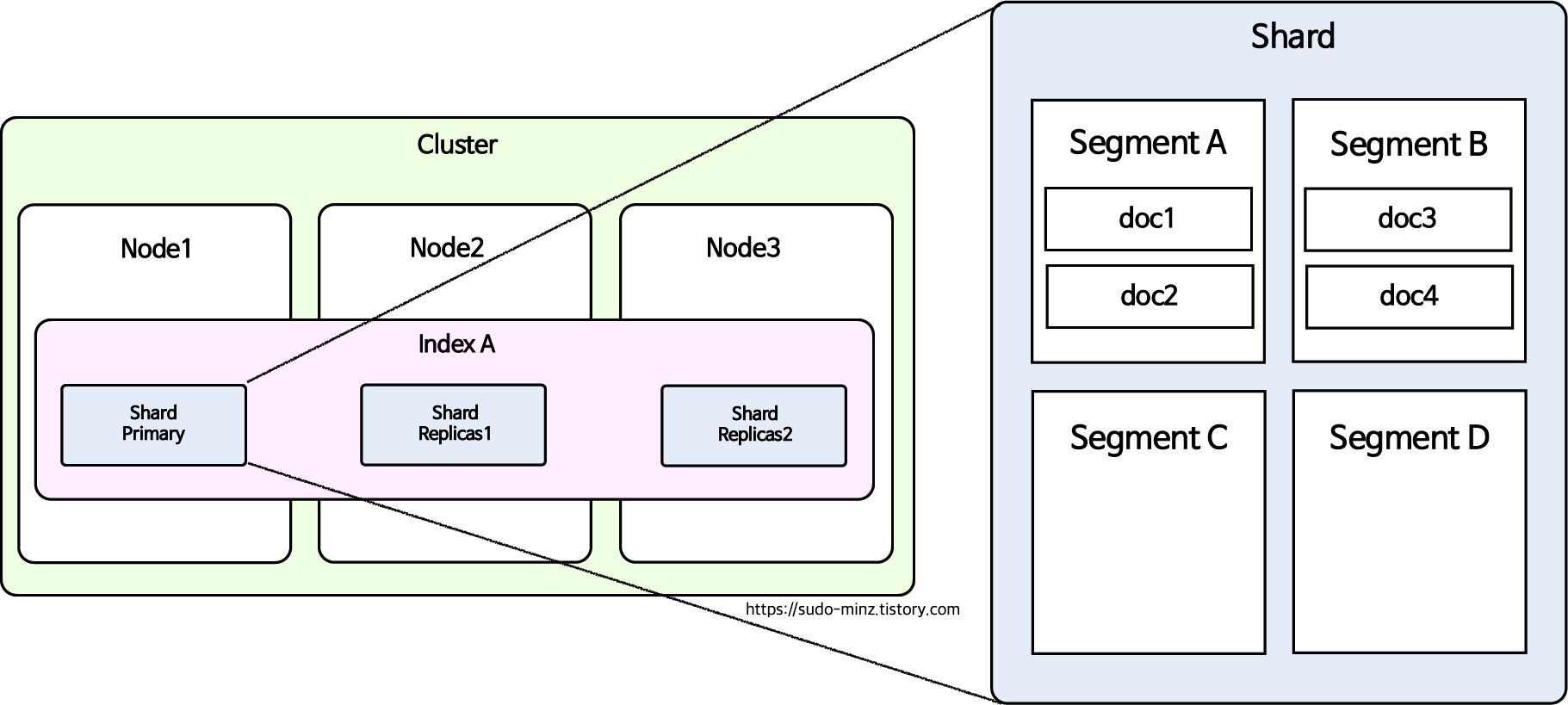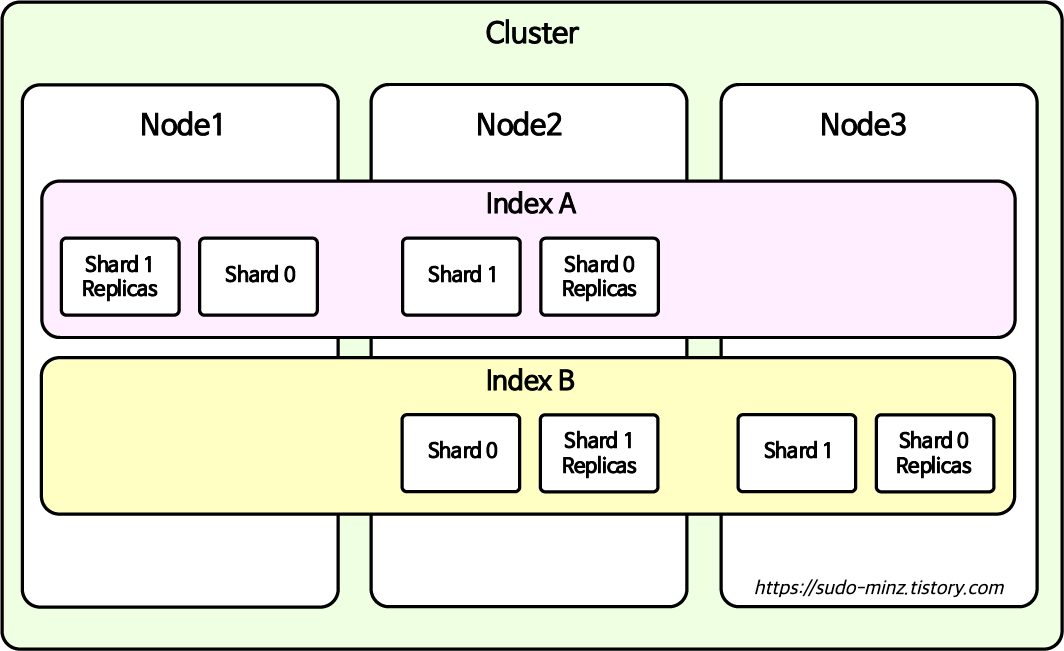 여기까지의 Cluster / Node / Shard 개념을 구조도로 보고 넘어 갑시다.