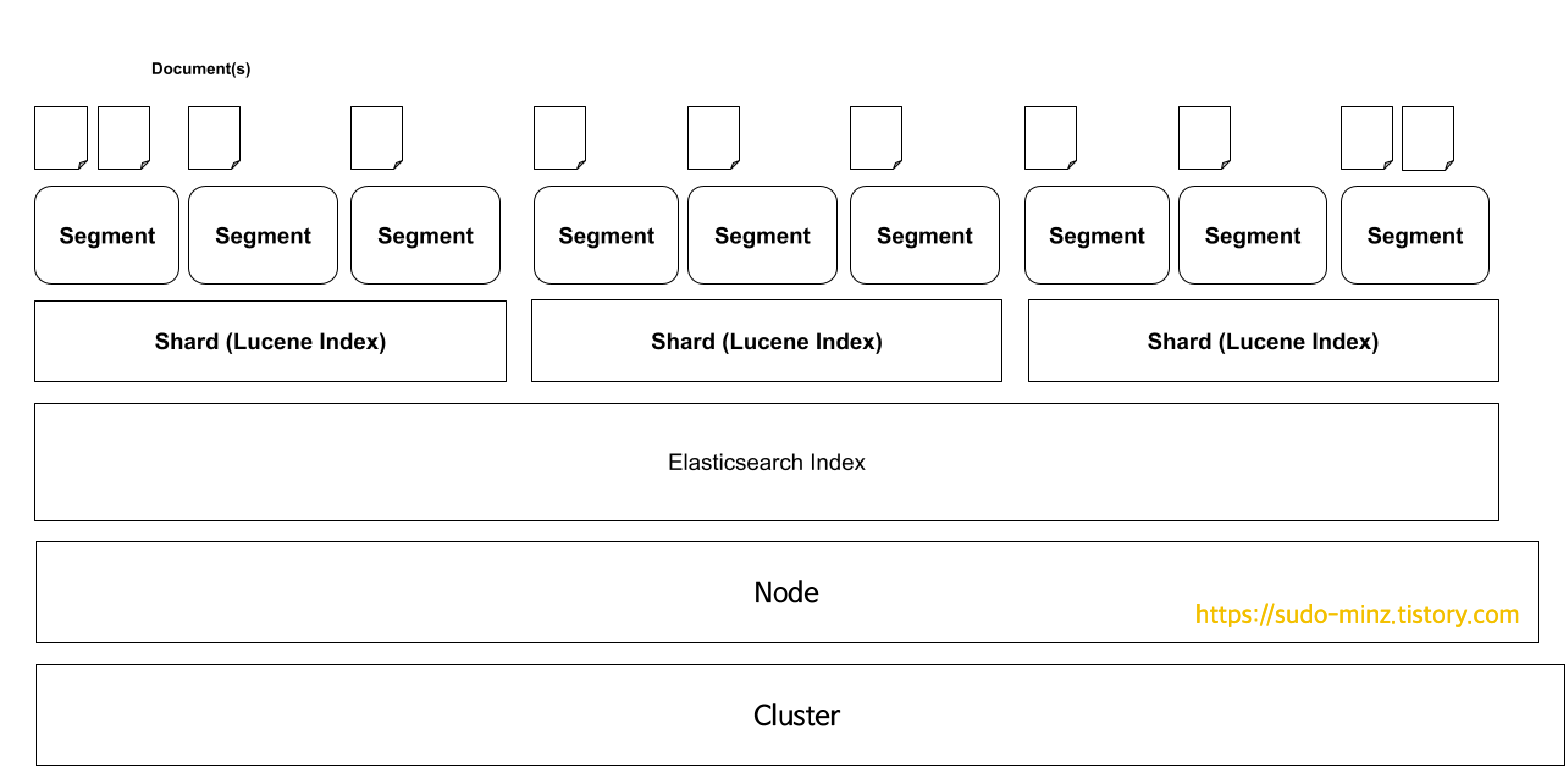 - Elasticsearch 구조는 크게 Document → Index → Shard → Node → Cluster 로 이어지는 계층 구조를 가진다.