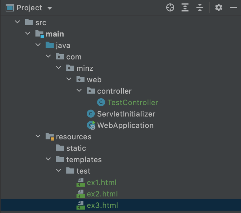 resources 아래의 templates 아래 test라는 폴더를 만들고, 실습에 필요한 ex1 등의 html 파일을 생성한다.