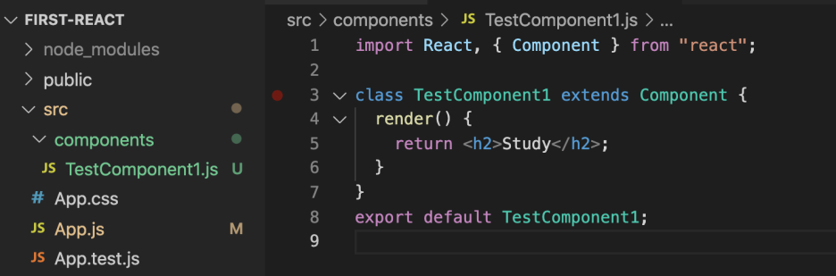 여기에 TestComponent1.js 라는 이름의 파일을 만들어 아래와 같이 입력한다.