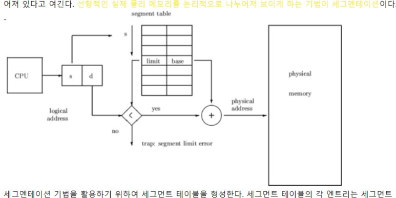 하지만 프로세스를 물리적인 단위인 페이지 말고 논리적 내용 단위인 세그먼트로 자를 수 있는 세그먼테이션 방법이 있다.
