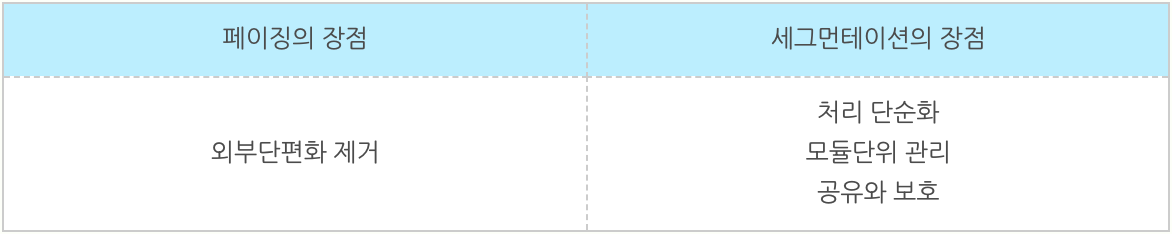 | 프로그램은 다수의 페이지로 분할 | 프로그래머가 컴파일러에게 프로그램 세그먼트를 명시해줌 |