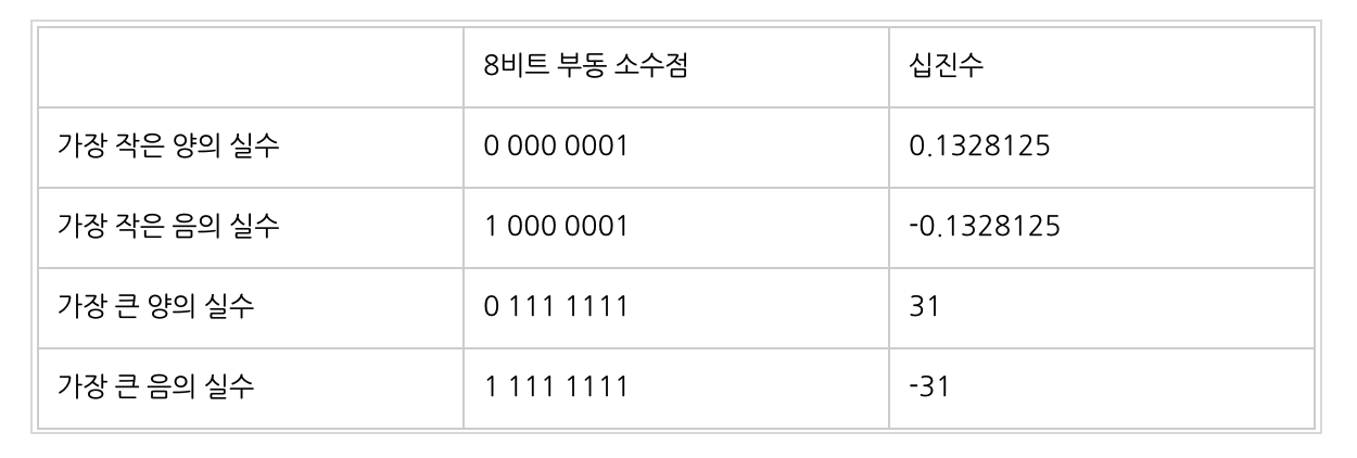 8비트 부동소수점 표기법에서는 아래의 범위 만을 커버할 수 있다.