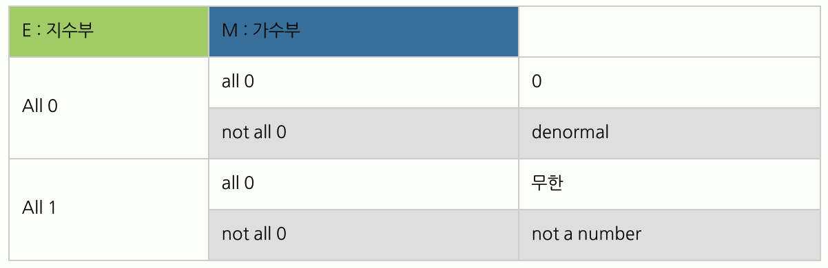 너무 작아서 표현할 수 없는 수는 지수부 모든칸을 1로 채우고, 가수부는 0으로 채우지 않아