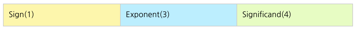 이 숫자에서 지수와 가수를 나누어 아래 형식처럼 표현한다. 8비트를 가정했을 때, 각 부분에 다음처럼 비트를 할당한다고 생각해보자.