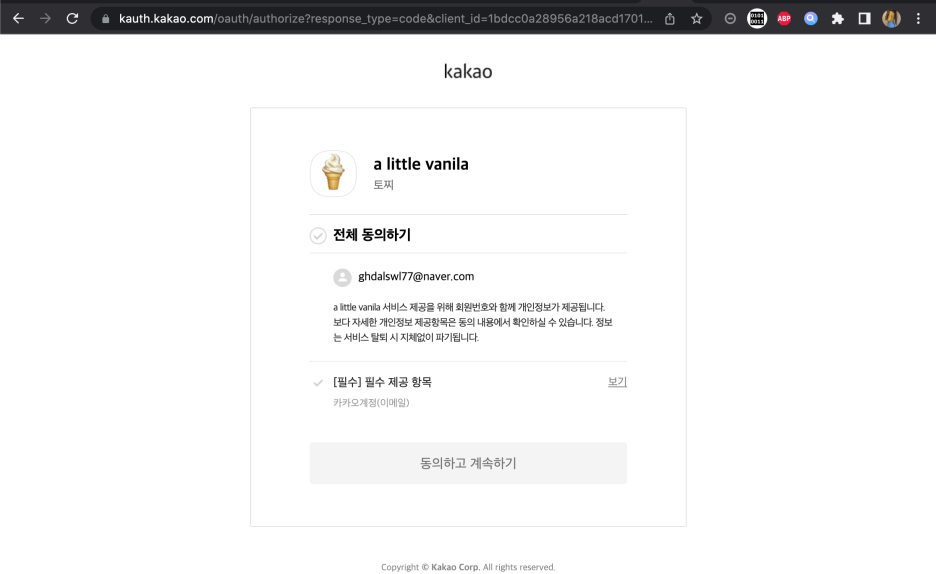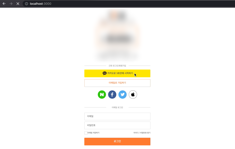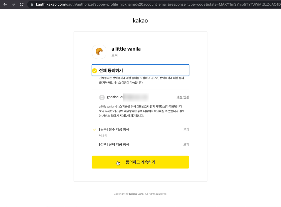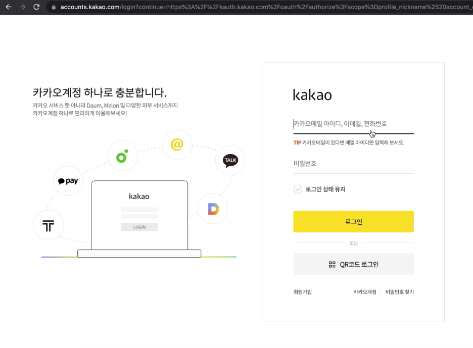 위의 한 줄만 추가후 실행해서 http://localhost:8080/oauth2/authorization/kakao 로 접속하면 아래 화면이 뜬다.