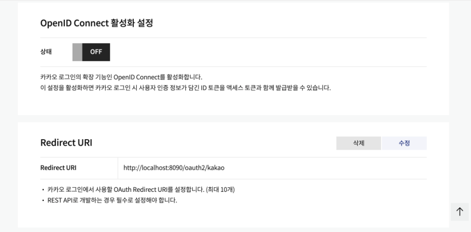 로그인 시 이 Redirect URI를 통해 우리가 얻으려는 code(인가코드)를 반환 받는다.