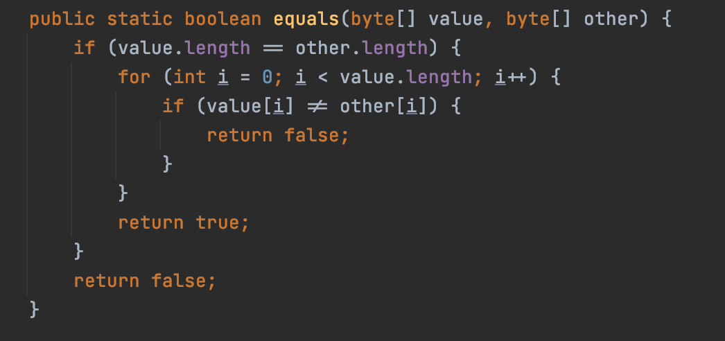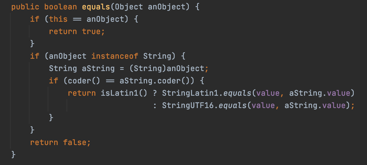 객체가 다른 경우 인자가 String이라면 문자열을 비교하여 동일한지에 대한 결과를 리턴하고 있다.