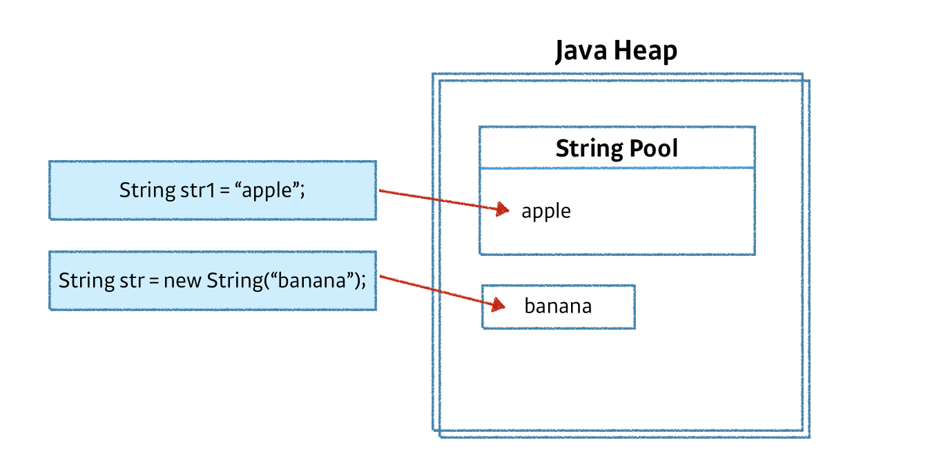 new를 통해 String을 생성하면 Heap 영역에 존재하게 된다.