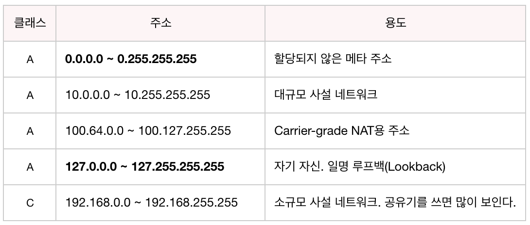 E클래스는 IP주소 관련 연구, 실험용으로 남겨둔 주소로 구분하여 사용했었다.
